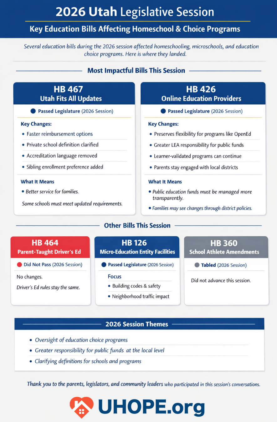 After discussion, the board vote was evenly divided, resulting in UHOPE taking a neutral position on the bill. Board members reviewed multiple versions of HB 467 as it evolved during the session, and discussion reflected the range of perspectives within the homeschooling and education community. Some expressed appreciation for improvements that strengthen accountability and program clarity, while others raised questions about how certain participation requirements could affect some private schools or microschools serving scholarship students.
